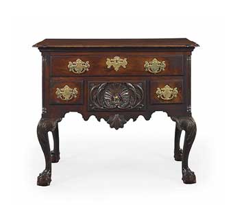 Made in one of the leading cabinetmaking shops and decorated by a carver with particular flair, this dressing table is a masterful display of mid-eighteenth century Philadelphia craftsmanship. The case can be firmly ascribed to the shop of Henry Cliffton (d. 1771) and Thomas Carteret, whose work is documented by a high chest signed and dated 1753 at Colonial Williamsburg. Displaying meticulous construction throughout, the signed example has a lower case with vertical drawer dividers that extend fully to the backboards and three case bottoms, one under each drawer, that are secured by finely cut glueblocks on the underside. These details are all seen on the dressing table offered here as well as on other case pieces attributed to the shop, including the high chests made for Benjamin Marshall and Benjamin Hartley. Further supporting the attribution to a common source, the Marshall and Hartley high chests feature distinctive front skirts that are identical in design to that on this table. While the Cliffton-Carteret shop used a variety of designs, their skirt profiles all display a similar liveliness (see Eleanore P. Gadsden, “When Good Cabinetmakers Made Bad Furniture: The Career and Work of David Evans,” American Furniture 2001, Luke Beckerdite, ed. (Milwaukee, 2001), pp. 65-87; Christie’s, New York, 19 May 2005, lot 109; for a slab-table from the same shop with a different but similarly spirited skirt, see fig. 2, lot 159 in this sale).