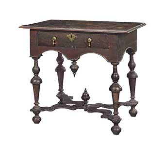 This dressing table varies from all the above cited with its single long drawer, a rare feature that may indicate an early date of production. The same format appears on dressing tables with box or H-stretchers dated closer to 1700, but the vast majority of surviving American dressing tables with cross stretchers are fitted with three small drawers (for examples with box or H-stretchers, see Lindsey, p. 144, nos. 48-49). Only two other Pennsylvania examples of the form with single drawers have been found. Dated 1710-1730 and 1700-1730, these comprise tables at the Metropolitan Museum of Art and Yale University Art Gallery respectively. Because of the single-drawer format, these tables and that offered here feature atypical skirt designs and differ from the tripartite designs that echo the drawer divisions on forms with three short drawers. On the MMA table, the skirt is a single, flattened arch, while the Yale table and the table offered here feature bipartite designs (Frances Gruber Safford, American Furniture in the Metropolitan Museum of Art, Early Colonial Period (New Haven, 2007), pp. 339-341, cat. 131; Ward, pp. 203-204, cat. 98; for other dressing tables with single drawers and cross stretchers but of unknown origins, see Wallace Nutting, Furniture Treasury, vols. I and II (New York, 1928), nos. 388, 396). The table offered here also displays nail holes and a distinct shadow indicating that it was previously and most likely originally fitted with an applied molding running below the drawer and continuing on the case sides. Another possible indicator of an early date of production, this detail appears on desk forms, including a mahogany example dated as early as 1705 (Lindsey, pp. 118, 147, no. 68, fig. 186).