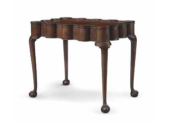 Eye-catching, designed in America and exceptionally rare, this turret-top tea table illustrates one of the most celebrated furniture forms from colonial America. The repetition of fourteen turrets along and around the rails is an arresting arrangement, one that in its boldness and severity strikes a modernist note in comparison to its contemporaneous forms from mid-eighteenth century Boston. Like the block-and-shell furniture of colonial Newport, the turret-top tea table of Boston displays native ingenuity. English-made forms undoubtedly inspired its colonial innovators and Brock Jobe and Allan Breed in their recent study of the group illustrate a close probably London-made parallel with rims and skirts that follow similar outlines (Brock Jobe and Allan Breed, “Boston Turret-Top Tea Tables,” Boston Furniture, 1700-1900 (Boston: Colonial Society of Massachusetts, forthcoming). However, the use of half-round and three-quarter round turrets to decorate the perimeter of a rectangular form is not known outside the vicinity of Boston.