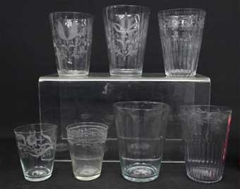 LOT OF SIX BLOWN GLASS ETCHED TUMBLERS, 4"to 6" in height.