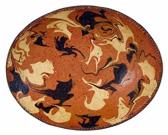 CONNECTICUT REDWARE OVAL LOAF DISH, EARLY 19th c., with cream and brown marbled slip decoration, 10.75" w.