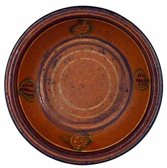 PENNSYLVANIA OR MARYLAND REDWARE BOWL, 19th c., with slip concentric bands and four leaf devices, 2.75" h., 9.5" diameter.