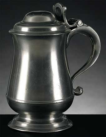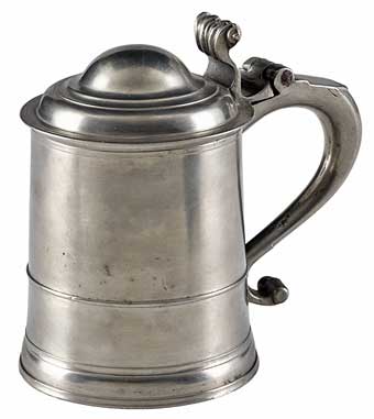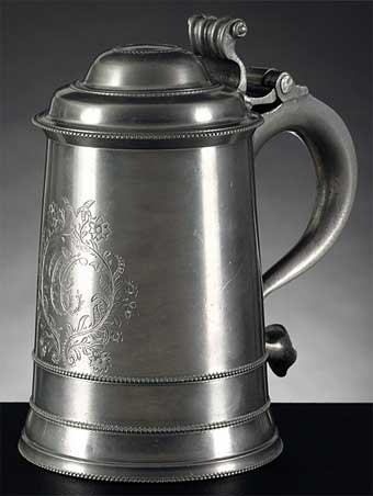FINE PHILADELPHIA PEWTER TANKARD, ca. 1780, attributed to William Will, with beaded bands and an elaborately engraved cartouche with a monogram, 7.625" h. This is an exceptional example of Philadelphia pewter and one of the finest American tankards extant.