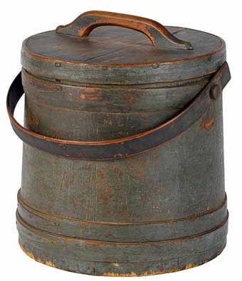 PAINTED PINE FIRKIN, 19th c., retaining its original blue/green surface, 12.25" h.