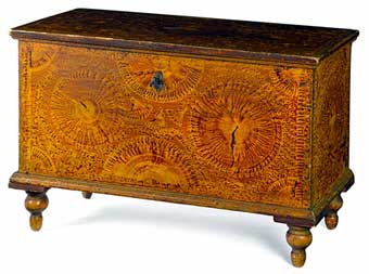PENNSYLVANIA PAINTED PINE BLANKET CHEST, 19th c., retaining its original vibrant sponge decoration, 25.25" h., 35.75" w.