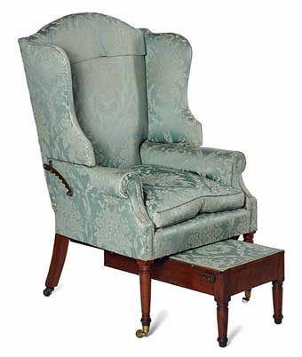 RARE SHERATON CHERRY MECHANICAL EASY CHAIR, ca. 1815, with an adjustable back and sliding footstool.
