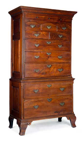 IMPORTANT CHESTER COUNTY, PENNSYLVANIA QUEEN ANNE WALNUT "OCTORARA" CHEST ON CHEST, ca. 1760, the upper section with a wall of troy molding, over a linen drawer and three arched drawers, above two short and three long drawers, flanked by raised panel sides, resting on a two-drawer base, supported by ogee bracket feet with closed spurs, 88" h., 43.25" w. Illustrated in Beckerdite, American Furniture 2011, fig. 47.