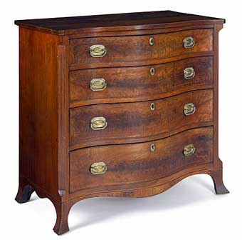 FEDERAL WALNUT SERPENTINE FRONT CHEST OF DRAWERS, ca. 1800, probably Western Pennsylvania, with a dramatically shaped front and chamfered comers, supported by flared French feet with overall line inlay, 37" h., 37" w.
