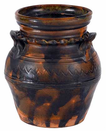 PENNSYLVANIA REDWARE CROCK, 19th c., with manganese streaked green glaze, 5.25" h.