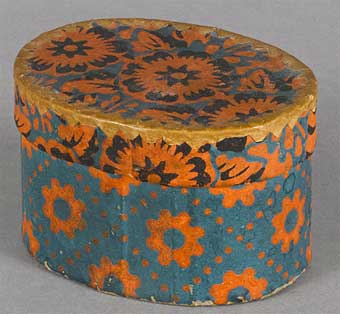 SMALL WALLPAPER DRESSER BOX, 19th c., with orange decoration on a blue ground, 2" h., 3" w.