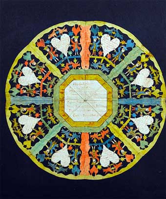 WATERCOLOR AND CUTWORK VALENTINE, dated 1762, with central script surrounded by love birds and soldiers holding hearts, 13.5" diameter.