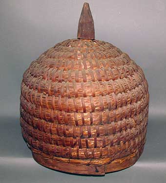 RARE COILED RYE STRAW BEE SKEP, with wooden hoop base & wooden plug, ca. early-mid 19th century; thick coiled rye straw with rough sapling splint binding in domed shape, skep with carved and shaved wood top plug with pointed top, make-do added hoop band, wire mounted to lowest damaged coil, 15.5"d, 17”h.