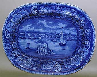 HISTORIC BLUE DETROIT PLATTER, ca. 1830; historic blue transfer platter with flower and scroll border, blue ink back stamp "Detroit" by James & Ralph Clews, also importers bue ink back stamp "Neff Wanton & Co/ Louisville" (sic Neff Walton & Co), English Staffordshire earthenware, 14.25"x 18.5”.