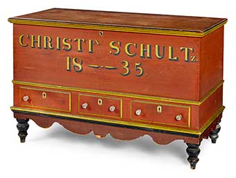 UNUSUAL BERKS COUNTY, PENNSYLVANIA PAINTED POPLAR DOWER CHEST, dated 1835, inscribed Christia Schultz, 31.25" h., 46.75" w.