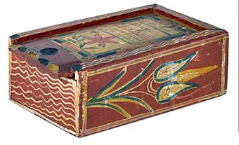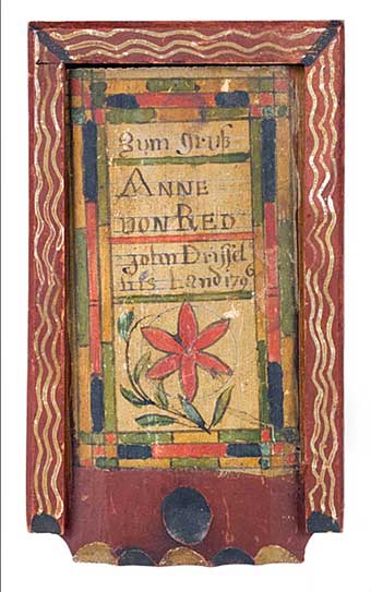 JOHN DRISSEL (BUCKS COUNTY, PENNSYLVANIA 1762-1846), PAINTED PINE SLIDE LID BOX, inscribed on lid Zum gruck Ann von Red John Drissel his hand 1796, retaining its original decorated surface with flowers and ivory wavy bands on a vibrant salmon ground, 2,75" h., 4.375" w., 7.625" d. Anna Von Red - Anna Roth was born November 17, 1793 as listed in the New Goschenhoppen Register, page 343.