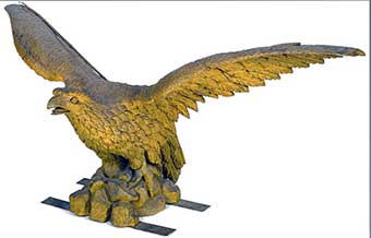 MONUMENTAL AMERICAN CARVED AND PAINTED SPREAD WINGED EAGLE ORNAMENT, ca. 1810, retaining an old yellow surface over remnants of original gilding and a period wrought iron fastening plate, 27" h., 57.5" w. The large size, construction, and carving make this exceptional eagle most likely from the workshop of Benjamin Rush (1756-1833).