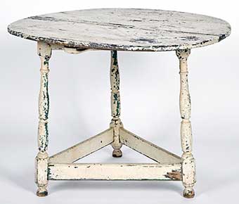 PAINTED HARD PINE TAVERN TABLE, 18th c., retaining an old layered paint history, 28" h., 36.5" w.