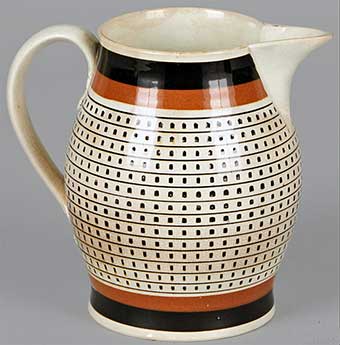 MOCHA PITCHER, 19th c., with line and dotted bands, 6.25" h.