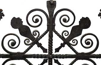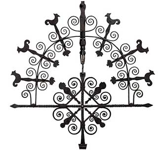 IMPORTANT PENNSYLVANIA WROUGHT IRON POT HOLDER, ca. 1800, from the Sally Ann (Hunter Furnace), Rockland Township, Berks County, the outer ring with volutes and chickens, around an inner ring with profile busts of an African American woman, purportedly the wife of the iron master, 40.5" x 43.5”.