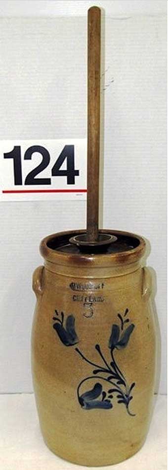 VERY GOOD ANTIQUE 5 GALLON STONEWARE COBALT TULIP FLOWER DECORATED BUTTER CHURN.