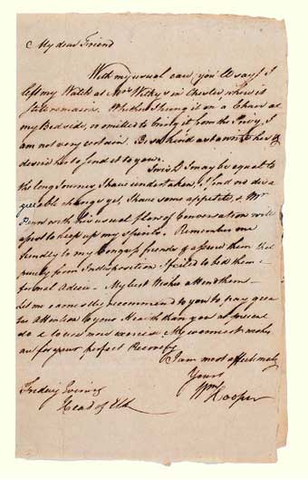 It is probable that Hooper stayed at Mary Withy's Inn, a boardinghouse some 15 miles south of Independence Hall in Chester Pennsylvania, for his letter begins: "My dear friend, with my usual care (you'll say) I left my Watch at Mrs. Withy's in Chester where it still remains. Whether I hung it on a Chair at my Bedside, or omitted to bring it from the Privy, I am not very certain.  Be so kind as to write her & desire her to send it to you."