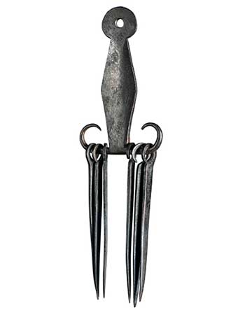 A SET OF SIX WROUGHT IRON HEARTH SKEWERS AND HOLDER, LATE 18TH-EARLY 19TH CENTURY, Overall length 9.75 inches.