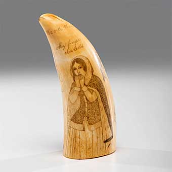 A SCRIMSHAW WHALE’S TOOTH, AMERICAN, MID-19TH CENTURY, inscribed Bark Kathleen and My fingers are cold, Length 5.125 inches.