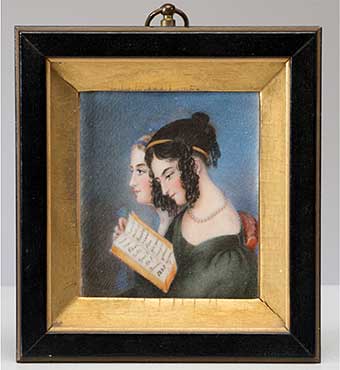 A MINIATURE PORTRAIT OF TWO YOUNG WOMEN, CIRCA 1835, on ivory, dated on book. 5 x 4.5 inches.