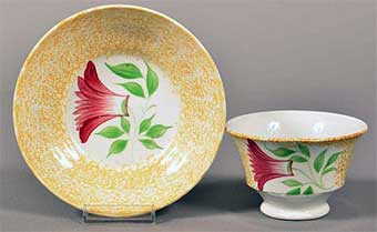 YELLOW SPATTER CHINA THISTLE PATTERN CUP AND SAUCER, red flower with green leaves. Saucer measures 6" diameter