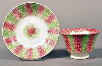 RED AND GREEN RAINBOW SPATTER CHINA CUP AND SAUCER. Saucer measures 5.625” diameter