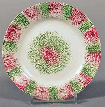 RED AND GREEN RAINBOW SPATTER CHINA CUP PLATE, 4.375” diameter.