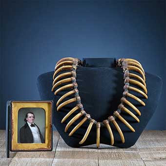 31 honey-colored grizzly claws of graduating size are strung on a hide thong; leather spacers placed between each claw, overall length 18.75 in.  Includes a half-length oil portrait miniature of Thomas Willard Hough; housed in a half plate pressed leather case; painted in Cincinnati, ca 1842-1843, 6.25 in. x 5.25 in., second quarter 19th century