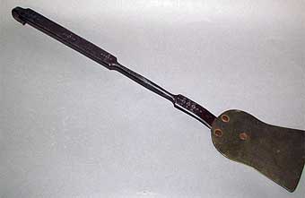 HANDMADE HICKORY BROOM, 11.75” broom w/36” handle. Broom peeled down made from one piece of wood. Some deterioration on outside of surface of broom. The lady whose booth it was in, Fern Ney, said that it came from her mother’s summer kitchen on a farm at Kempton near Hamburg, Berks Co., PA. Bought at the White Horse Antiques Market, Mt. Joy on Oct. 12, 1995. [1402]