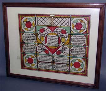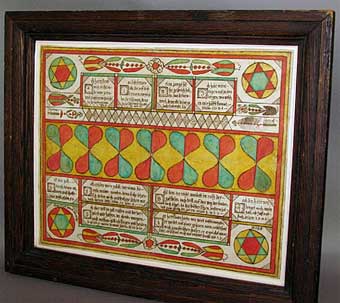 FRAKTUR RELIGIOUS WRITINGS BY HANS JACOB BRUBACHER, 12.875” x 15.875”, extremely good colors: black, red, yellow & green. Wide yellow band through the center w/pairs of 2 lobed hearts, one upright, one inverted with alternating green and red lobes. At four corners circles enclosing a star of David, 10 rectangular spaces each contain a psalm. Some paper loss to 2 green lobes of hearts. Signed HIBB anno 1799 the 14th of March, also bears names of Johannes Schenck, the owner. Johannes (c.1757-1836) was the son of Michael Shenk (d. 1782) & Barbara______ of Providence Twp., Lancaster Co. Johannes married Magdalena Stauffer, a daughter of Johannes Stauffer & Barbara Good. Johannes Shenk had a son, John (1786-1825), who predeceased him. His farm went to grandson John M. Shenk (1818-1891) and eventually to his granddaughter, Frances K. Shenk who d. 1992. Having remained in the Shenk family since 1730, I bought it at the estate sale of France K. Shenk of New Providence on Jan. 23, 1993. On 1/16/94 I paid Franklin Shores for conservation & encapsulation. Note: a 1799 religious text made by HJBB was also sold & was purchased by Ruth Bryson, Quarryville. It was made for Magdalena, wife of John Schenk. [1304]