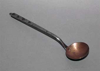 RARE MINIATURE TASTING SPOON WITH HEART INLAYS, 5.625” L, copper bowl is 1,375” D. Finely wrought with tiny hanging hook. Iron handle is inlaid with four tiny copper hearts measuring .1875” wide. Hearts have pin holes suggesting that copper was poured when molten. See Lasansky, To Draw, Upset, and Weld, p.72. Note: Fred S. Weiser owns related pieces which were previously owned by Mae Haverstick Brenneman of Neffsville, PA. This came from a household (Dirian Family) on Kissel Hill Rd, Lititz. I bought it at Horst Auction on April 2, 2003. Jan., 2006, I took it to Fred Weiser’s to compare to his. He said that Winterthur & Eugene Charles each have one. All four have different numbers of hearts inlaid. [2115]