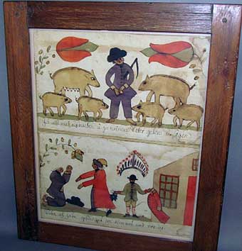 EXTREMELY RARE FRAKTUR “THE PRODIGAL SON” BY FREDERICK KREBS, c. 1800, approx. size 12.875” x 16”, nearly identical to plate #53 in Weiser’s book, PA German Fraktur. Top scene: feeding the swine, lower scene: he returns home. Partially torn along center fold, parts of border wash has been slightly trimmed, some minor stains, colors are sharper than the example in the Free Library. Piece was handed down in the Herr family of Lampeter area. Line of descent is as follows: Christian Herr (1732-1815) m. Maria Bowman, Lime Valley; Bishop Christian Herr (1780-1853) m. Anna Forrer, Lime Valley, Lampeter; Christian Herr (1808-1885) m. Susan Brackbill, Lime Valley; John B. Herr (1834-1903) m. Frances Hess; Henry B. Herr (1859- ) m. Barbara Harnish, Lampeter; John H. Herr (1885- )m. Ada Shaub, Lampeter; J. Elvin Herr (1908-1961) m. Elizabeth Landis (1908-Feb. 14, 2002), Refton; I purchased it from Elizabeth L. Herr, widow of J. Elvin Herr of Refton on Sept. 8, 1982. She found it in an old account book belonging to the first two Christian Herrs along with two Hans Jacob Brubacher pieces (which she donated to the Hans Herr House, one dated 1766 and one 1801, both made for Maria (Bowman) Herr). A truly wonderful piece. [754]