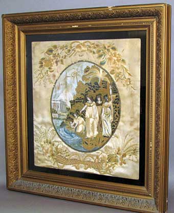 RARE AND IMPORTANT LITITZ MORAVIAN GIRL’S SCHOOL NEEDLEWORK, c. early 19th century. Central oval silk embroidered and painted scene of four women and baby with pyramids, temple and Moses’ mother in the background. Entitled “Moses & Pharoah’s Daughter” and signed Margaret Pennington. Surrounded by a silk embroidered floral, fruit and cornucopia border. Has 1/4” hole in upper part of border, 1/4” hole in sky section of scene, overall soiling, 2” chip to top edge of frame and minor losses to frame. For related examples see Patricia Herr’s “Ornamental Branches: Needlework and Arts from the Lititz Moravian Girl’s School Between 1800 and 1865”. 19.5” x 22” scene; 28.5” x 31” framed [This item was owned by Clarke, but was not included in his inventory list]