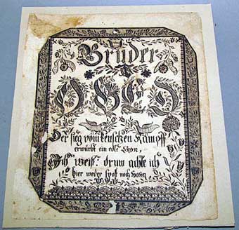 RARE AND IMPORTANT EPHRATA FRAKTUR, 7” H X 6’ W. Executed in brown ink, unusual format. Border has floral vines and minute stippling. Base has rows of mounds with flowers springing from them (the grave mounds of the host that have gone before), A pair of birds, floral vines and an intricate illumination of “Bruder Obed” “Der sieg vom frenschen kampff erwürbt ein edle Cron, Ich Weiss; drum achte ich hier weder spott noch hohn.” There is a loose portion and losses along the left border, and holes in the center of the top and bottom border where it has been tacked to the wall. It is a unique Ephrata memorial Fraktur for Brother Obed, one of their most important members. Obed (c. 1717- July 27, 1792) or Ludwig Hacker came from Germantown to Ephrata, on Dec. 28, 1744. He and wife Margaret (sister Albina (d.1767) divorced, each joining the celibate orders, as did their daughter Mary (sister Petronella 1738-1791). Obed served as schoolmaster for the Cloister. They are buried in God’s Acre Cemetery. I Daniel Rupp notes that it was customary to make a memorial Fraktur after the death of a member, and hang it up in their cell. This is the only known example of an Ephrata Momento Mori. I photographed this piece in January, 1991 at Larry Bomberger’s when I visited him about borrowing The Eliz Amweg cap for the exhibit at the Joseph Schneider Haus in Kitchener, Ontario. It was in the desk drawer in an old plastic sleeve. He didn’t know where he had gotten it. He thought it probably came from his parents. I bought it at Larry’s sale, lot #148, on Nov. 9, 2002. (See p. 221 I Daniel Rupp History of Lancaster County). [2050]