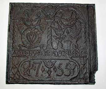 RARE CAST IRON STOVE PLATE DATED 1755, cast at Elizabeth Furnace, Elizabeth Twp., Lancaster Co., by Jacob Huber (d. 1767). 25.5” L x 24” H. It is the right side panel of a 5-plate stove, three columns and two arches, enclose tulips, a heart, a circle, a sheaf of wheat, stars, etc. Below that is the inscription “JACOB HUBER 1ST DER ERST DE” (utscher) or, “Jacob Huber is the first German who can make iron.” It is the same as plate # 158 in Mercer’s Bible in Iron. It is also the same style as the stove that once stood here in the Hess Homestead. I found numerous pieces of the side plate in the junk pile below the garden shed in 1985. Huber was the inn keeper at the tavern on Newport Rd. north of Lititz. That farm was purchased in 1850 by my g-g-great grandfather Christian Snyder (1809-1868). This plate is the first Huber plate that I’ve ever seen for sale. About 20 years ago, Greg Kramer of Cleona bought the same one that appears in Mercer’s Book #159. He sold it to Randy Huber, whom I met a dozen years later. He subsequently brought this plate to Lititz to show me. I bought it on August 25, 2001 at the York Towne Auction, lot #514, at the York Fairgrounds. [1926]