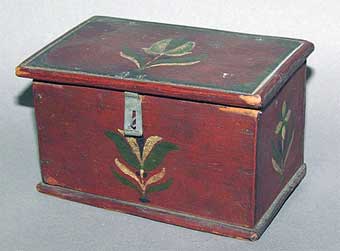 WEBER BOX, Small red box with floral decoration. 2.75” h x 4.5” L x 3” D. Tulip on front, a flower on either end, and on the top. Has a tin hasp. There is a repair to the top rear edge where the hinges attach. A pencil inscription on the inside lid reads “Anna Souder”. An earlier inscription reads John? Hershey?. John and Rose Anna Kolar bought it from Steve Hench of Lancaster. Sold at the Kolar Sale at Christie’s Auction, NY, NY on Jan. 17, 2003, lot #637. I bought it from Steve Still at the York Show, Jan. 31, 2003. [2077]