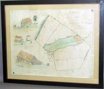 RARE LANCASTER COUNTY LAND DRAUGHT, 24”W x 18.5”H. Signed in corner, “W. Herr, 1867”. E. Lampeter Twp. farm of Benjamin R. Stauffer (1826-1914). Farm is located on east bank of Conestoga River, north of Rt. 30. That property is currently owned by Lancaster Country Club. Draught has wonderful illustrations of the buildings: a stone bank house built in 1786 by Johannes & Veronica Stauffer, an 1851 frame house built by Daniel & Maria Stauffer in 1851 and a stone bank barn built in 1765 by Johannes & Veronika Stauffer. Incredible detail, it is the best Lancaster Co. land draught I’ve ever seen. Johannes Stauffer (1737-1811) was born in Ibersheim in the Palatinate. He was the son of Christian Stauffer (d.1776) who immigrated in 1749 settling in Lampeter Twp. In 1764, Johannes married Veronica Buckwalter (1746-1826). In 1791, he was ordained as a preacher at Mellinger’s Mennonite Meetinghouse. Youngest son Daniel (1771-1855) inherited the farm. Daniel m. 1803 Mary Rohrer. Their youngest son, Benjamin R. Stauffer (1826-1914) married (1) Elizabeth Mayer, m(2) Anna Kreider. This draught was sold at Nashville in Feb. I missed seeing it. Bought by Steve Smoot & B. Shoemaker. Later bought by Bruce Shoemaker of New Providence. He had it conserved by Franklin Shores. I bought it from Bruce at Black Angus on May 16, 2005. [2728]