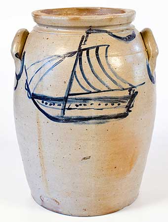 EXCEEDINGLY RARE AND IMPORTANT FOUR-GALLON STONEWARE JAR, with Cobalt Sailing Ship and Flag Motifs, Baltimore, MD origin, circa 1840, ovoid jar with tooled shoulder, squared rim, and applied lug handles, decorated with a large brushed design of a sailing ship with waving pennant. The hull is decorated with a series of spots representing gun ports or portholes. Reverse decorated with a spotted and striped flag or pennant emanating from a flowering garland extending from handle to handle. The decoration on the reverse likely depicts a closer view of the pennant flying from the ship on the front, probably representing a United States Navy commissioning pennant. Commissioning pennants were given to any ship commissioned by a given country's navy and flew the colors of the nation they represented. Once a commissioning pennant was hoisted, its entry into active naval service began. Typical U.S. Navy commissioning pennants featured a series of white-on-navy stars followed by a series of red-and-white stripes. The jar's reverse is additionally decorated with six vertically-brushed cobalt slash marks, reminiscent of the gallon markings on Edgefield, South Carolina stoneware, appear at the shoulder. In this case, the meaning of the markings is unknown, as the jar measures four gallons and is marked as such under one handle. Cobalt highlights to handle terminals with a curved line of cobalt extending from terminal to terminal under one handle. Excellent color, featuring dark, crisp cobalt against distinctive light-gray Baltimore clay. To date, only four other pieces of 19th century Southern stoneware featuring ship decorations have been documented. Two of this group also originate from Baltimore, one being an incised ship jar with related floral motif, attributed to Elisha Parr, and currently on display at the William C. and Susan S. Mariner Southern Ceramics Gallery at the Museum of Early Southern Decorative Arts in Winston-Salem, North Carolina. Among the most outstanding examples of regional stoneware to come to market in recent years.