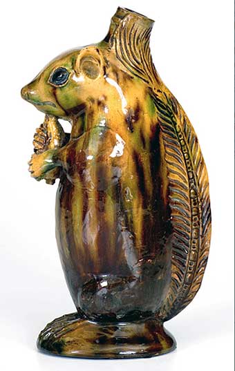 EXCEPTIONAL GLAZED REDWARE SQUIRREL BOTTLE, Salem, NC origin, circa 1804-1829, molded figure of a standing squirrel holding a strawberry, the surface decorated with streaks of copper and manganese over a yellow ground and covered in a clear lead glaze. The mold of this bottle differs from two other types of squirrel bottles documented in Johanna Brown's Ceramics in America 2009 article, "Tradition and Adaptation in Moravian Press-Molded Earthenware." Other period bottles produced from a similar or identical mold can be seen in Erickson, Hunter, and Hannah, Ceramics in America 2009, "Making a Moravian Squirrel Bottle," figs. 23-25. The mold used on this particular bottle includes a less-commonly-seen, angled spout with beaded edge that extends off the back of the squirrel's head. Interestingly, the bottle to be auctioned features a different style of coggled decoration on the squirrel's tail than is commonly seen, featuring an open circle followed by smaller punctates. Typical coggling on the squirrel's tail appears as a continuous series of open circles or punctates. In addition, while most Moravian squirrels depict a small clay ball (or nothing at all) between the squirrel's paws, this example features a well-defined strawberry with raised seeds and small stem. This work is also the first Salem squirrel bottle that we have seen featuring dark slip highlighting the eyes. This treatment, however, can been seen on lady bottles and at least one owl from this school. The owl, likely made during the same period as this squirrel, features closely-related streaked copper and manganese decoration over a yellow clay ground. Despite condition issues, this previously-undocumented piece is a noteworthy new discovery in Moravian molded ware, ranking among the most high-styled squirrel bottles produced in this Southern ceramics tradition.