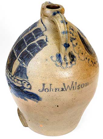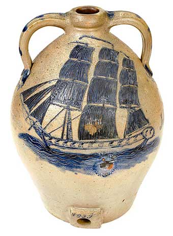 OUTSTANDING AND IMPORTANT FOUR-GALLON STONEWARE PRESENTATION COOLER, with Incised Ship Decoration, Inscribed "John B. Wilson" and Dated "1839," attributed to Abial Price, South Amboy, New Jersey, 1839, ovoid jug with semi-rounded spout, heavily-tooled shoulder, ribbed handles, and squared bunghole, decorated with a large incised and cobalt-highlighted sailing ship featuring three masts bearing large sails and three pennants, the bow with scrolled embellishment and bowsprit holding three smaller sails, the hull with eleven portholes, and stern with two portholes. Heavily incised waves, also highlighted in cobalt, appear below. Bunghole incised with cobalt-highlighted date, "1839." Side of cooler incised with the cobalt-highlighted name, "John B. Wilson." Reverse decorated with a distinctive brushed design of a tulip emanating from wreath-shaped leaves, characteristic of the work of the New Jersey-trained potter, Abial Price, underscored by a highly unusual band of overlapping circles, accented with spots. Striped decoration to handles and cobalt highlights to handle terminals. This work features one of the finest renderings of a sailing ship in American-made ceramics, noteworthy in its size and detail. The incised decoration, spanning an impressive 9.25" tall by 12" long, includes intricate and accurate features throughout, including exceptionally-deep carving to the vessel's sails and sawtoothed embellishments to the gunwale. This maritime masterwork is easily the finest example of New Jersey stoneware that we have ever offered and among the finest surviving works from a state integral in the development of the American salt-glazed stoneware tradition.