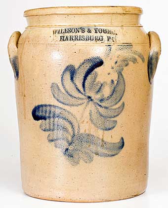 VERY RARE ONE-GALLON STONEWARE JAR, with Cobalt Tulip Decoration, Stamped "WILLSON'S & YOUNG. / HARRISBURG PA," circa 1855, cylindrical jar with tooled shoulder, semi-rounded rim molding, and applied lug handles, decorated with a large brushed design of a tulip with pronounced stamen. Cobalt highlights to maker's mark and handle terminals. Desirable size and fine color.