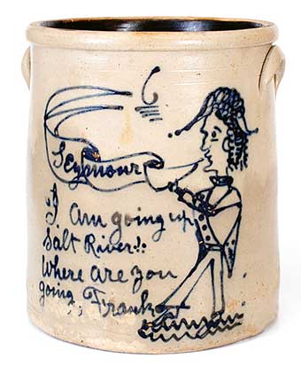 OUTSTANDING AND IMPORTANT SIX-GALLON STONEWARE CROCK, with Cobalt Figural Decoration and Political Inscription, OH origin, 1868, large-sized, cylindrical crock with applied lug handles, tooled shoulder, and semi-rounded rim, featuring a large slip-trailed design of a standing man with hat and buttoned coat, holding a waving banner, inscribed "Seymour." Further inscribed below in cobalt slip, "I am going up / Salt River!. / Where are you / going Frank." Slip-trailed underscored "6" above. This political cartoon crock references the U.S. Presidential Election of 1868, in which Democratic candidate, New York Governor Horatio Seymour (1810-1886) was defeated by the Republican candidate, Ulysses S. Grant (1822-1885), Commanding General of the Union Army during the Civil War. Seymour, a popular figure in the Democratic Party, had served as the chairman of the Democratic National Convention in 1864 and 1868. After numerous indecisive ballots at the event in 1868, the convention nominated Seymour, a man who was not seeking the presidency, but reluctantly accepted. The choice before the voters between Grant and Seymour was also squarely one between civil rights and encroachment on the newly-found freedoms of blacks. Indeed, the Election of 1868 was the first presidential election after the abolition of slavery, and the entire fate of Southern blacks in particular was at stake, with even the Fifteenth Amendment (which enshrined universal suffrage) not being ratified until 1870. But beyond this, the plain racial dynamic of the election was made clear by Seymour's running mate, Union Major General Francis Blair (the "Frank" on the crock), who made racist invective part of his standard campaign rhetoric. (It's worth noting that one pro-Seymour political ribbon of the time was emblazoned with the motto, "This is a white man's country: let white men rule.") That the public understood the Seymour-Blair ticket to be one entwined with racism is seen, for example, in a couple of the newspaper items illustrated above that specifically reference the Ku Klux Klan. The public repudiated the Democrat ticket, with Grant winning in an electoral college landslide of 214 votes to Seymour's 80. He received strong support in his native state of Ohio, where this piece was made, winning by over 41,000 votes. His victory was in part achieved by 500,000 votes from blacks. The term "going up Salt River" is a slogan dating as early as 1827 that came to symbolize political defeat. It was popularized as a political term in 1839 by Ohio Representative, Alexander Duncan (1788-1853), when he used it in a House of Representatives speech. The Salt River is a 150 mile-long river that runs through Kentucky and empties into the Ohio River, the main waterway of the region. To "go up Salt River," then, is to take an unconventional and treacherous route that leaves you lost or worse. This crock, featuring historical significance, profuse decoration, and an exceptionally-larger 11" height to the rendering of Seymour, is regarded as a masterwork of Ohio stoneware and among the finest examples of regional stoneware to come to auction in years. Scattered exfoliation to base. Some fry to cobalt. Light staining. H 14".