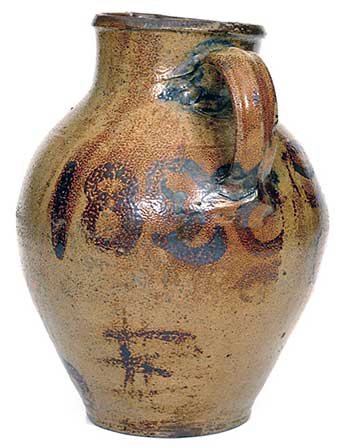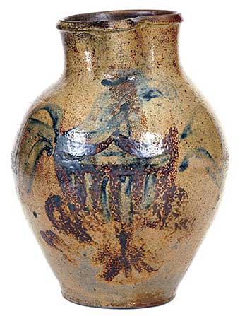EXCEPTIONAL ONE-GALLON STONEWARE PITCHER, with Cobalt and Iron Federal Eagle Decoration, Dated "1820," Ohio River Valley origin, 1820, finely-potted pitcher with narrow base, highly-ovoid body, tooled shoulder, and short collar, decorated with a large design of a Federal eagle with shield across its chest, applied in widely-brushed strokes of cobalt and iron slip. Reverse of pitcher boldly-dated "1820" in large iron-slip numbers. A large looping flourish, also brushed in iron slip, appears to the right of the date on the reverse/side of the pitcher. Additional crosshatched and figure eight designs appear at the base of the pitcher. Brushed cobalt highlights the handle terminals. This pitcher was produced early in the introduction of cobalt-decorated stoneware to the rapidly-developing Ohio River Valley. Related works include an outstanding large-sized cooler with incised Federal eagle motif, also highlighted in blue and brown slips. Combining a large two-color-slip figural design, extremely early date, and stylish form, this pitcher is among the most important stoneware pieces from the region to come to auction in years. Few pieces of this age and origin exhibit decorative quality of this level, the heavy-handed brushwork and juxtaposition of colors creating a wonderful folk art representation of our national symbol.