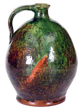EXCEPTIONAL COPPER AND MANGANESE GLAZED REDWARE JUG, Maine origin, early 19th century, highly-ovoid jug with footed base, flared spout, and applied strap handle, the surface decorated with a striking combination of manganese and copper glazes. The employment of both colors on the same jug is highly unusual, creating a beautiful work of folk expression--indeed, among the most beautifully-glazed New England redware objects we have handled.