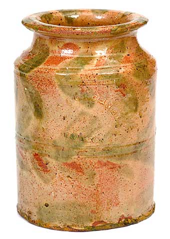 VERY RARE AND IMPORTANT REDWARE JAR, with Green Foliate Decoration, Stamped "W. BURCHNELL / LONDON," William Burchnell, London, Madison County, Ohio origin, circa 1835, straight-sided jar with tooled midsection and shoulder, tapered neck, and flattened rim. Surface covered in a speckled, straw-colored slip applied over a speckled reddish ground, then decorated with a continuous band of brushed copper-slip vining around the midsection, paired leaves at the shoulder, and a wavy stripe at base. Top of rim decorated with copper-slip stripes. Interior and exterior surface covered in a clear lead glaze. The potter, William Burchnell, was trained in Morgantown, Virginia (now West Virginia), and had joined fellow Morgantown potter, James M. Thompson, Jr., in London, Ohio by 1830, establishing a pottery on the site of the town's Presbyterian Church. Only a few signed examples of Burchnell's work are known, this jar being the only such piece to feature brushed slip decoration and the only to employ copper-oxide in its design. This jar is a wonderful example of migration of style among 19th century American artisans. Its decoration can be directly linked to earlier vessels produced in Morgantown by Jacob Foulke and John Wood Thompson. Pieces bearing the jar's distinctive straw-colored ground have also been documented in the work of Morgantown's potteries. The high decorative appeal of this jar rank it among the better signed examples of Ohio redware known.