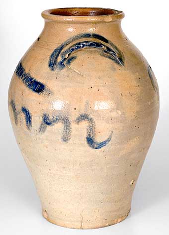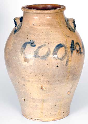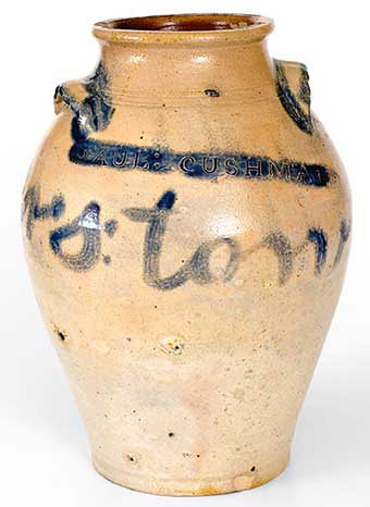 EXCEEDINGLY RARE AND IMPORTANT THREE-GALLON STONEWARE JAR, with Scalloped Handles and Cobalt Inscription, "Coopers:town," Stamped "PAUL : CUSHMANS," Albany, NY, circa 1812, vasiform jar with heavily-tooled shoulder, flared rim, and arching tab handles with scalloped carving to edges. Body of jar inscribed "Cooper:stown" in large cobalt script. Front of jar features the large maker's mark, "PAUL : CUSHMANS." Brushed cobalt highlights to maker's mark and handles. The village of Cooperstown in Otsego County, New York, was founded by William Cooper (1754-1809), a merchant, developer, and judge, who also served two terms in the United States Congress representing both Otsego County and Central New York. Cooper was also the father of James Fenimore Cooper (1789-1851), well-known author of several works of fiction, including The Last of the Mohicans. William Cooper originally established the town of Cooperstown in 1786 as the "Village of Otsego," as it was built of Otsego Lake. The village was incorporated in 1807, and the name was officially changed to Cooperstown in 1812 after its founder, who had died in Albany in 1809. It is believed that this jar was made to commemorate the renaming of the town and dates to the year 1812. Note the use of a colon between "Coopers" and "town" as seen on the coggled maker's mark, "PAUL : CUSHMANS." Of the town he founded, Cooper once wrote, "This was the first settlement I made, and the first attempted after the Revolution; it was, of course, attended with the greatest difficulties; nevertheless, to its success many others have owed their origin. It was besides the roughest land in all the state, and the most difficult of cultivation of all that had been settled; but for many years past it has produced everything necessary to the support and comfort of man." Today Cooperstown is best known as the home of the National Baseball Hall of Fame and also includes a number of other major museums. This work is the finest example of Paul Cushman stoneware to come to auction in years, featuring a highly-important inscribed decoration, brilliant color, and unusual ornamental handles.